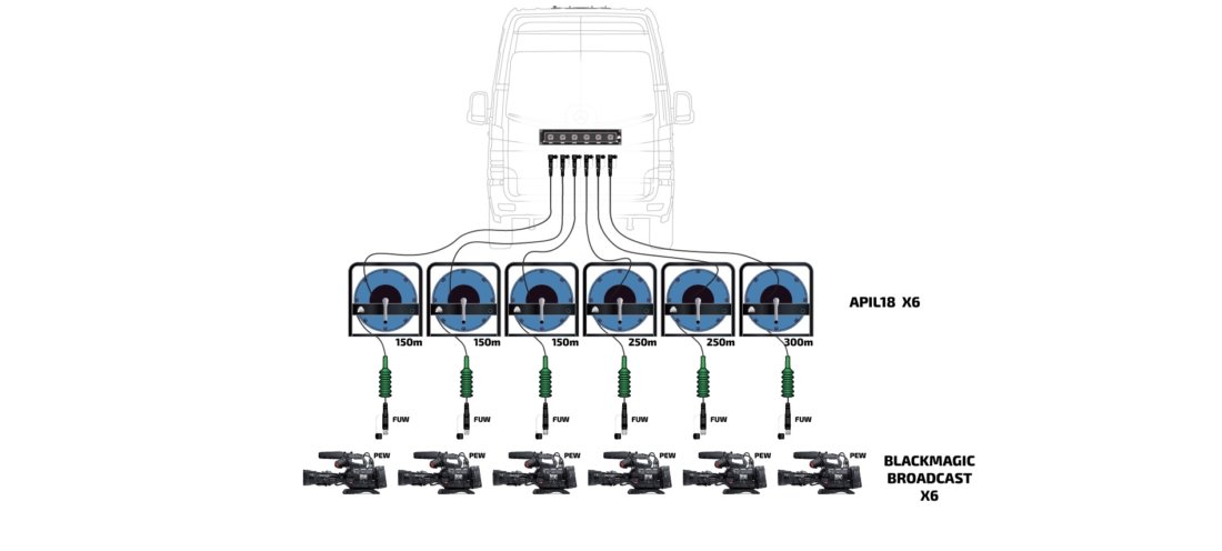 Para una segura conexión y transmisión de señales, en la unidad móvil se instaló un panel con 6 conexiones SMPTE 304 al que se conectarán 6 cámaras Blackmagic hacia sus CCU’s. Dichas cámaras podrán situarse a una distancia de hasta 300 m (en este caso, pero la longitud puede extenderse hasta 2 Km). Estas largas longitudes de cable quedarán almacenadas en enrolladores metálicos APIL 18 y APIL 42 asegurando una mayor durabilidad de este cable híbrido de fibra y cobre.