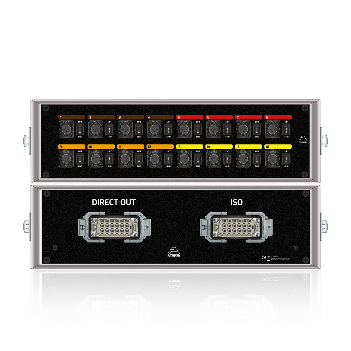 - Our microphones go to the Pinanson Splitter PTRS0919 that duplicates each signal to send direct sound to the room or event and to us without losing even 1% of quality. All this through a Harting multicore that has 16 CH.