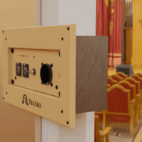 Caja personalizada para el auditorio de CaixaForum Valencia con conectores y logotipo según preferencias de cliente.