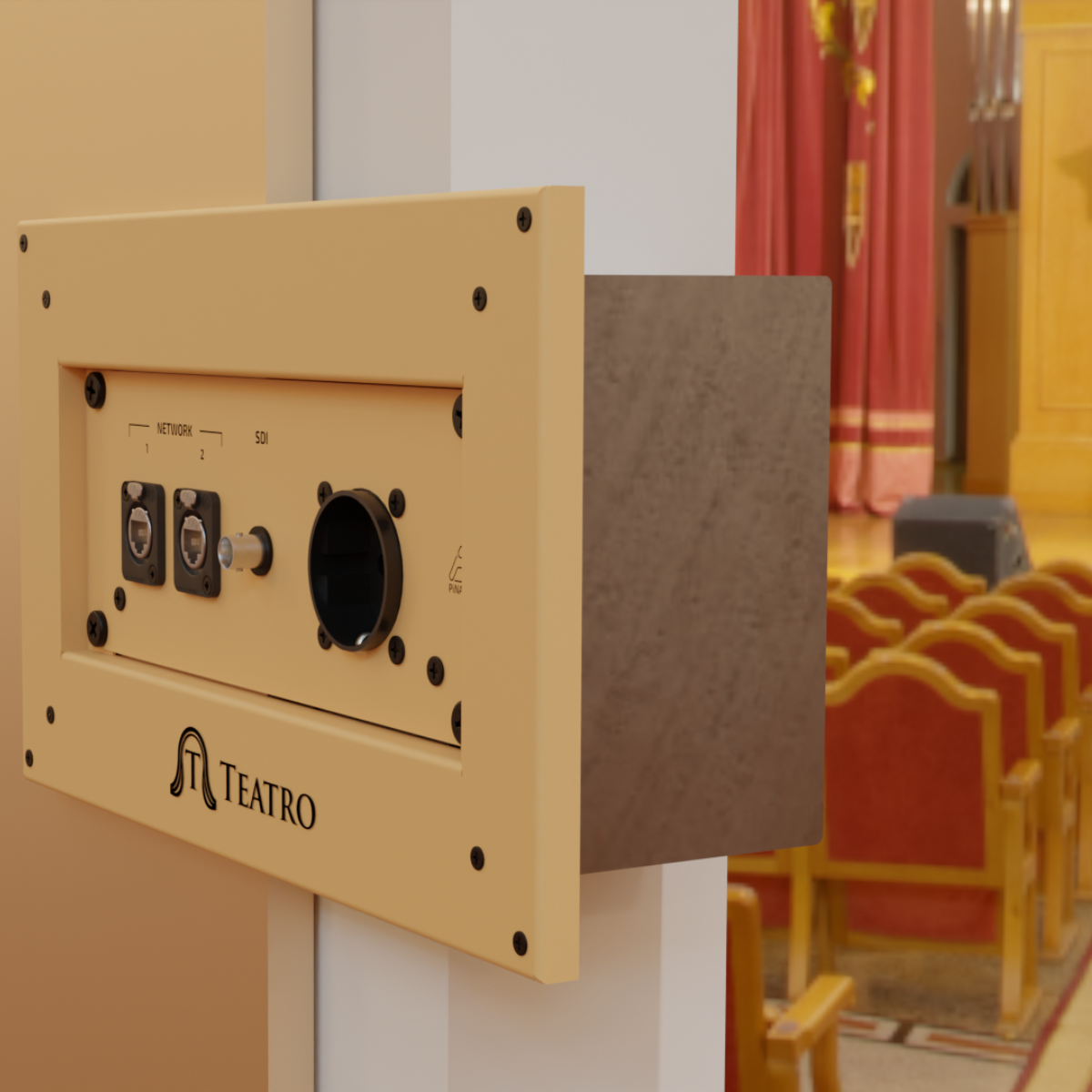 Caja personalizada para el auditorio de CaixaForum Valencia con conectores y logotipo según preferencias de cliente.